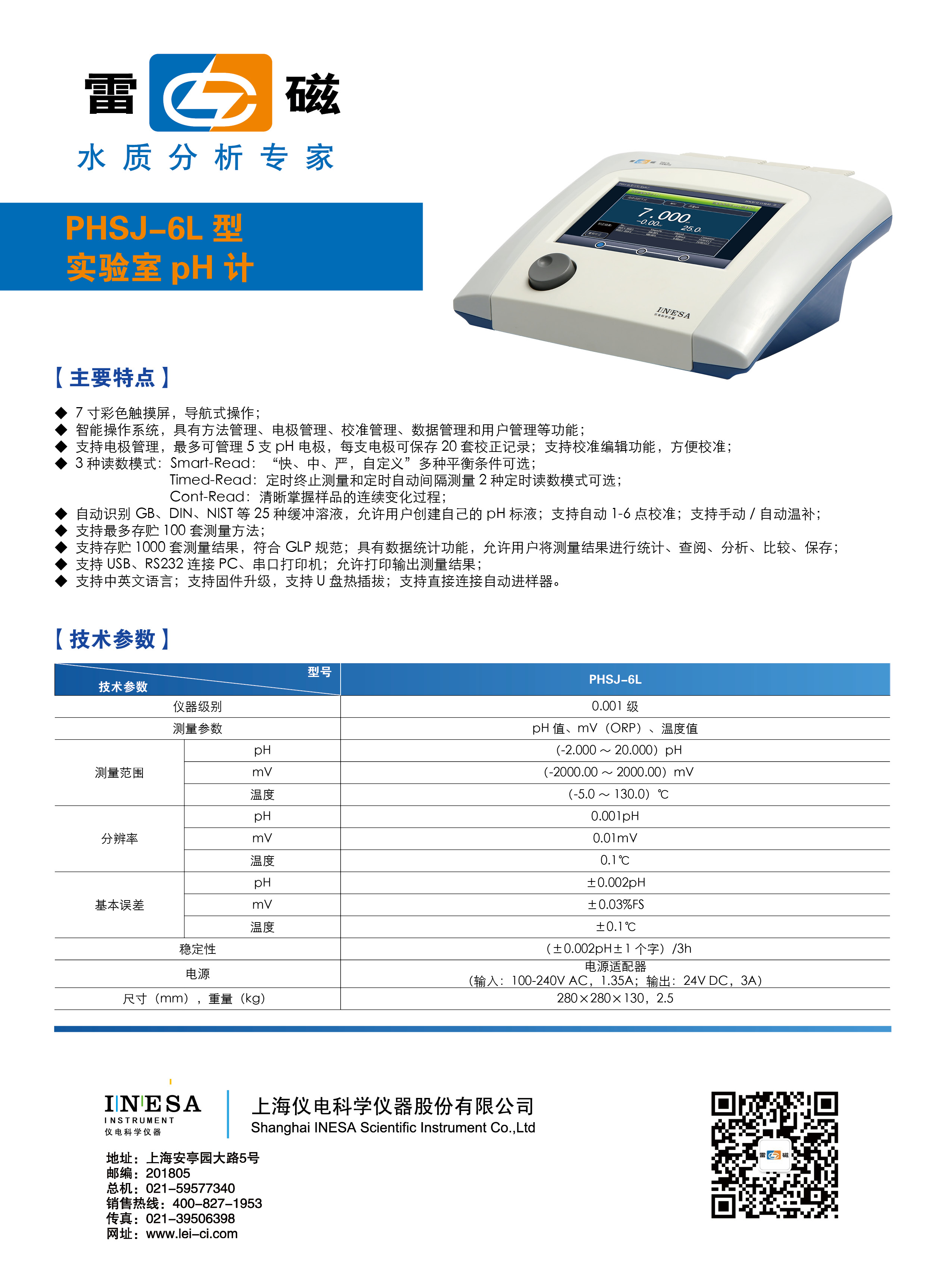 采用新型材料PC面板,輕觸數字式按鍵,可靠耐用;支持自動溫度補償,自動識別5種緩沖溶液,支持1-3點校準;支持USB連接PC、串口打印機;允許打印輸出測量結果。
